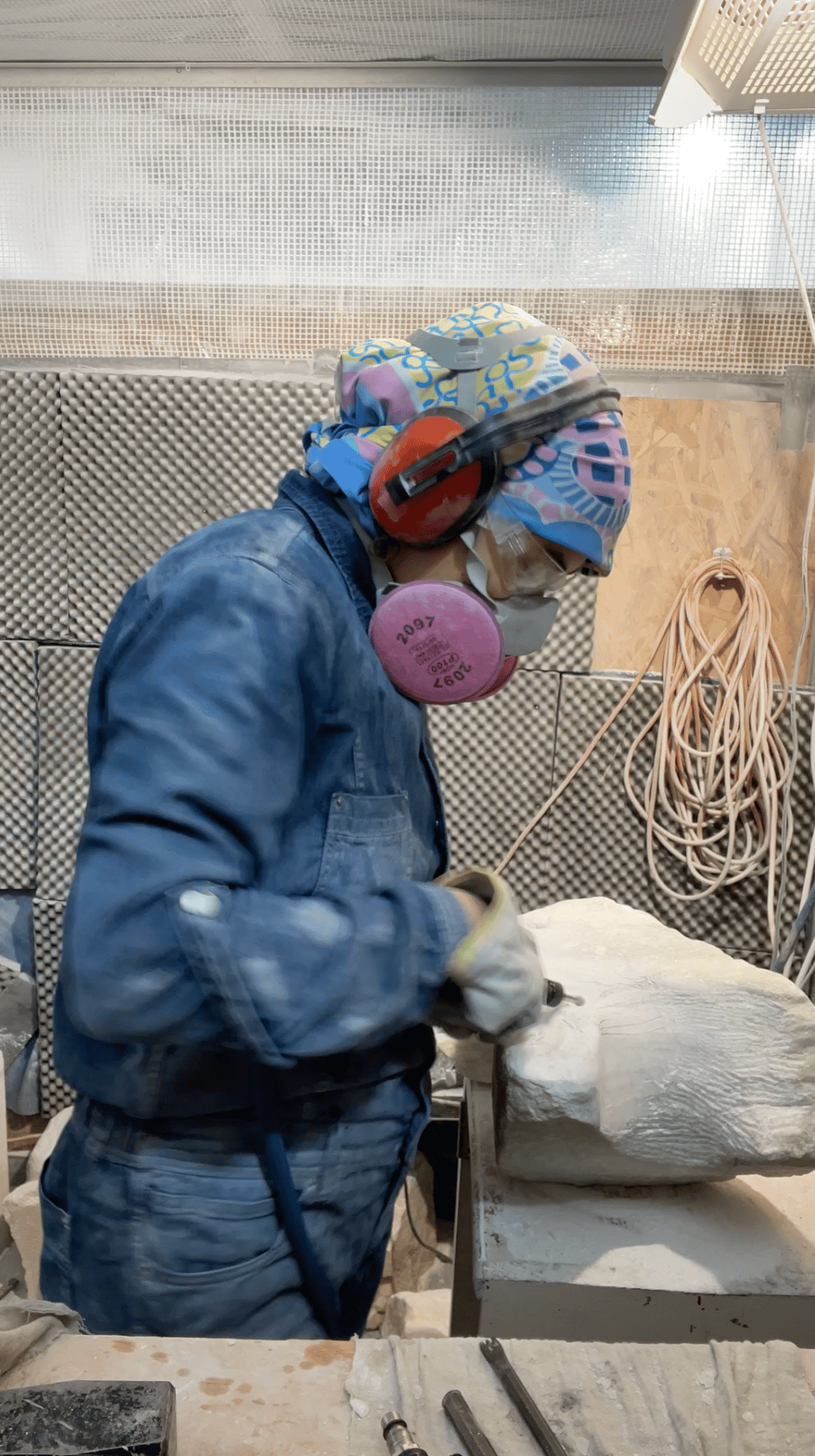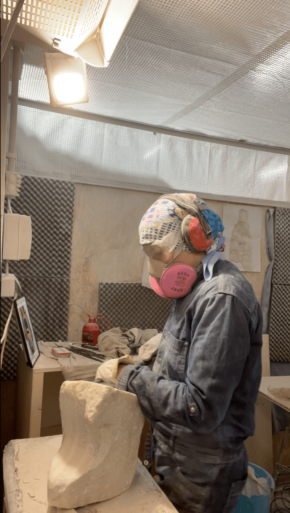 The final phase of the sculpting process is meticulously hand sanding the sculptures in order to get a smooth polished finish, pictured above is this sanding set up